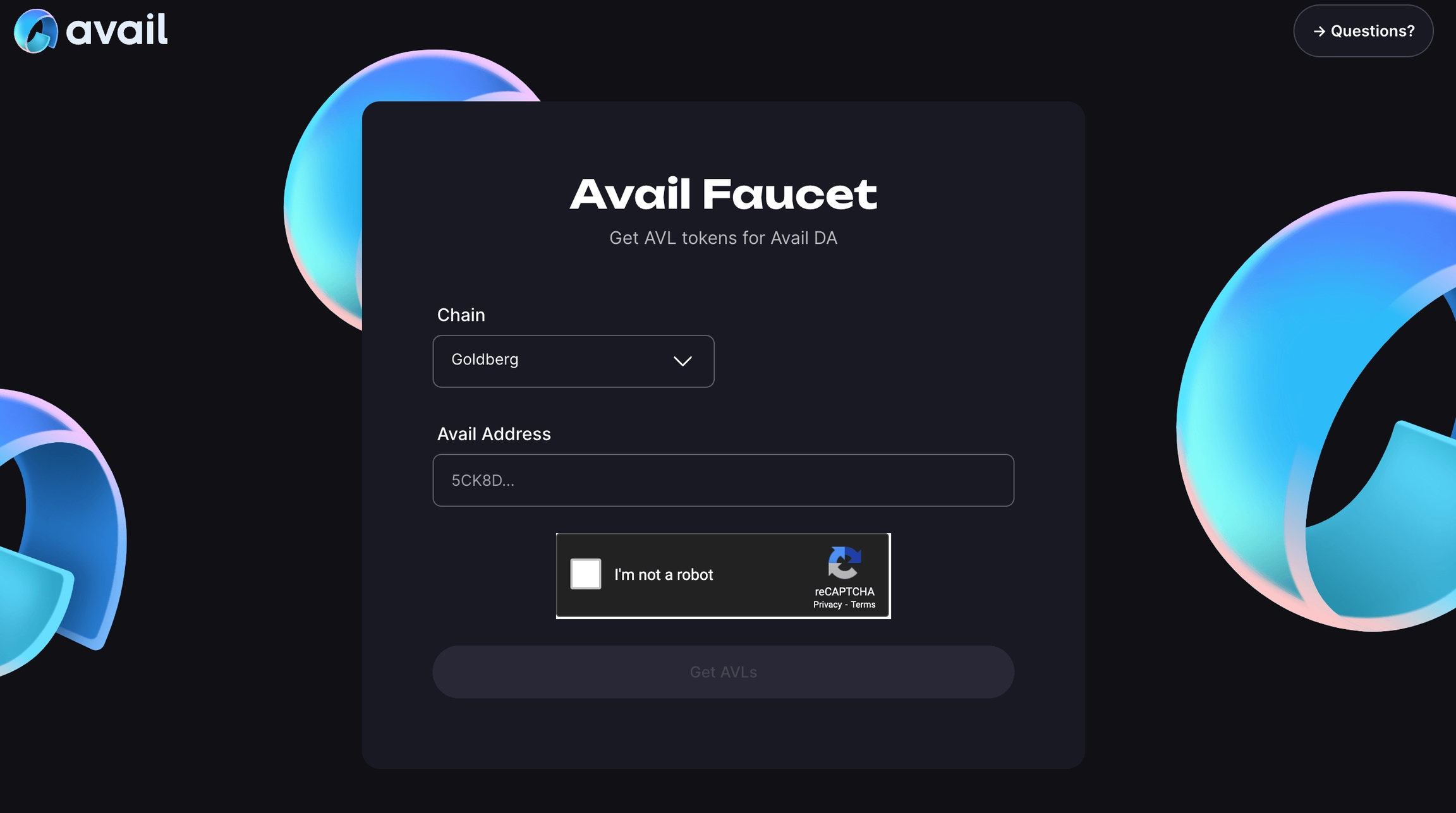 El faucet Avail testnet estará disponible en faucet.avail.tools(se abre en una nueva pestaña)para el futuro previsible. A partir de ahora, este es el único faucet con soporte oficial para Avail DA.