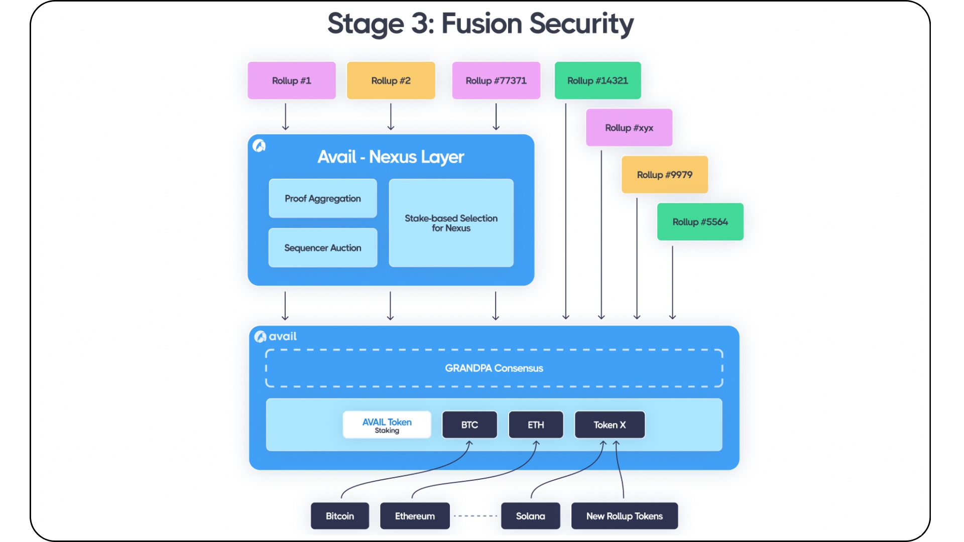 Avail Fusion completa la capa de unificación de Avail al proporcionar seguridad adicional al ecosistema de Avail y la capa de unificación de web3. Fusion permitirá que los activos nativos de otros ecosistemas importantes como Bitcoin y Ethereum se apuesten junto con los activos nativos de Avail. Esto permitirá a Avail aprovechar los activos maduros existentes para reforzar su propia seguridad criptoeconómica y marca uno de los primeros casos en los que se utilizan tokens extranjeros como ETH y BTC para impulsar el consenso sobre una cadena de bloques diferente.