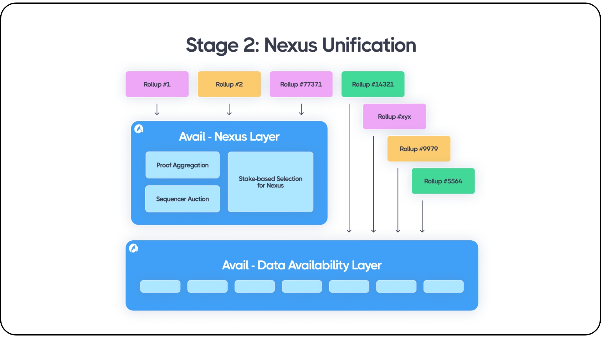 Avail Nexus es un paquete acumulativo de coordinación basado en pruebas de conocimiento cero en Avail DA que consta de una capa de agregación/verificación de pruebas y un mecanismo de selección de secuenciador que es posible mediante la incorporación de clientes ligeros Avail DAS (muestreo de disponibilidad de datos) basados en pruebas de validez y agregación de pruebas de ejecución. . La prueba agregada también se enviará a Ethereum.