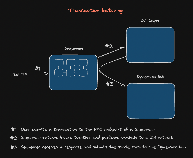 En un período configurable, el Secuenciador agrupa las transacciones procesadas localmente existentes. Los bloques agrupados se cotillean para mirar nodos completos, así como se publican en cadena en una red de disponibilidad de datos de la elección de RollApp. Los chismes de bloque proporcionan a los nodos completos de pares una latencia más baja para recibir actualizaciones de estado, sin embargo, la seguridad económica se deriva de la publicación de datos en una red descentralizada. Por lo tanto, los nodos completos de la red RollApp pueden solicitar datos de la red de disponibilidad de datos y verificar la raíz de estado de RollApp.