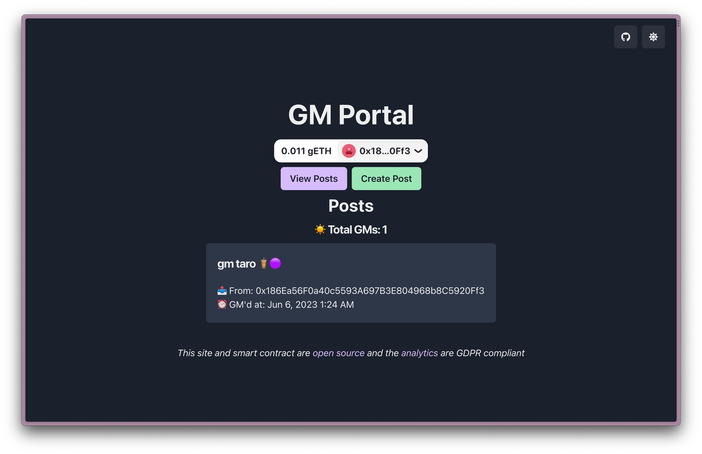 cp dev/gm-portal/contracts/out/GmPortal.sol/GmPortal.json dev/gm-portal/frontendInteractúa con la interfaz