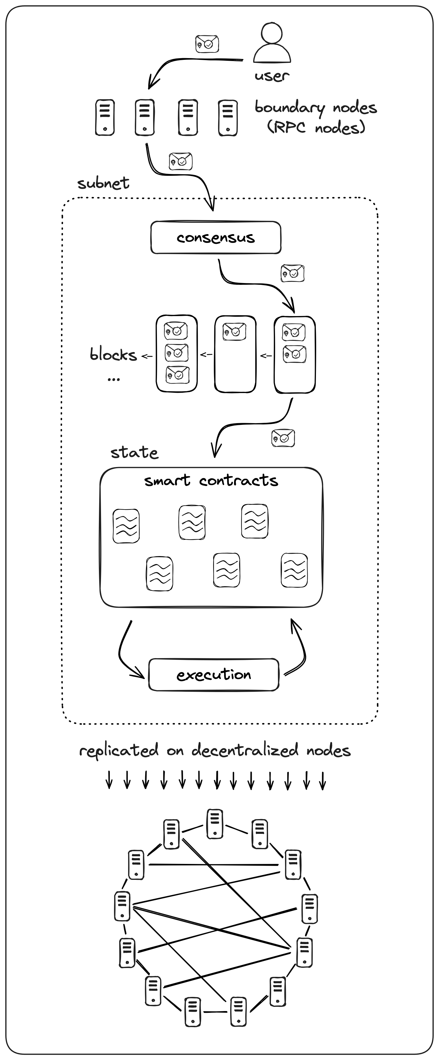 Una cadena de bloques solo puede funcionar tan rápido y ofrecer tantos recursos como un solo nodo. Una de las claves para superar este límite es la fragmentación. ICP fragmenta los contratos inteligentes en varias instancias de la cadena de bloques. Cada instancia se denomina subred y tiene su propio conjunto de nodos descentralizados que ejecutan el algoritmo de consenso entre ellos, construyen su propia cadena de bloques y ejecutan contratos inteligentes. Cada subred se ejecuta en paralelo con otras subredes. Un contrato inteligente en una subred puede comunicarse con otro contrato inteligente en una subred diferente mediante el envío de mensajes. Los usuarios también pueden enviar mensajes a los contratos inteligentes. El siguiente diagrama muestra el flujo de un mensaje en ICP: