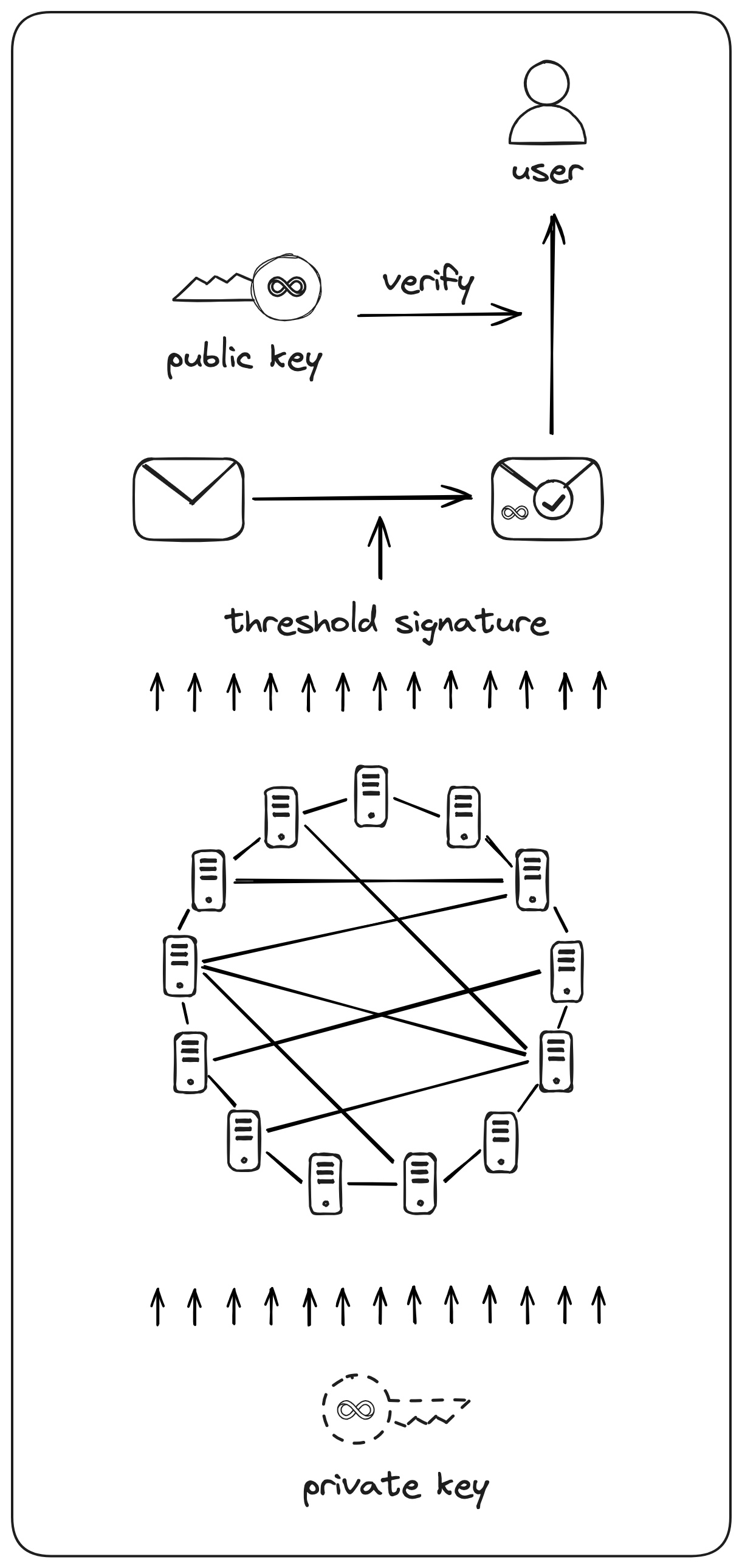 Cada subred ICP tiene una clave pública fija. La clave privada correspondiente no se almacena en un solo nodo ni está disponible en ningún nodo. En cambio, se divide en múltiples recursos secretos y se distribuye entre todos los nodos mediante criptografía de umbral. Los nodos pueden firmar mensajes de forma colectiva para los usuarios y otras subredes mediante estos recursos secretos. Esto hace que la validación del estado y los resultados sea trivial para los usuarios, ya que todo lo que necesitan hacer es verificar la firma digital con la clave pública fija sin descargar y validar bloques en la cadena de bloques.